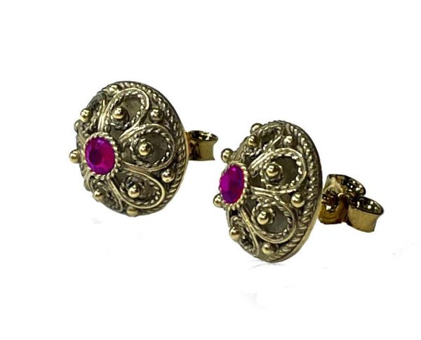 Gammelforgylt ørepynt av liten filigransknapp m/skarp rosa krystaller. Materiale: Sølv 830. Mål: 1,2cm.