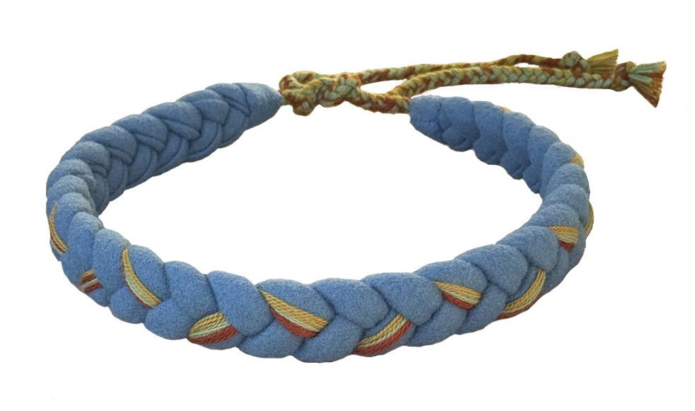 Flettet hårbånd til Vestfoldbunaden Segerbrandt. Laget av samme spesialfargede, blå ullstoff som bunaden, med innslag av brodergarn i farger fra bunadsbroderiet.