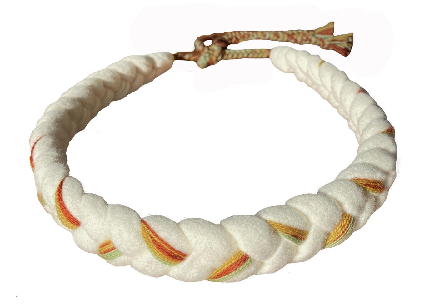 Flettet hårbånd til Vestfoldbunaden, laget av hvit klede med innslag av brodergarn i farger som bunadsbroderiet.