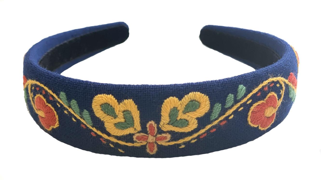 Håndbrodert hårbøyle i blå toskaft til Vestfoldbunad 1932.