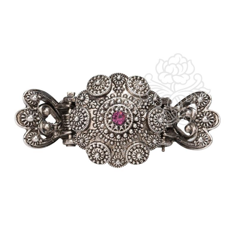 Mørk, sølvfarget hårklype med lilla sten som sitter godt i alle hårtyper. Laget av hardt, nikkelfritt stål.
